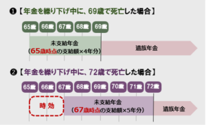 例えば、年金を75歳まで繰り下げ待機中の人が72歳で亡くなった場合、67歳時点の支給額が5年分、一括で支払われることになります。65歳から67歳の2年分は時効が成立し、未支給年金として請求することができません。